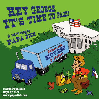 HEY, GEORGE, IT’S TIME TO PACK WE’RE GONNA TAKE OUR COUNTRY BACK THIS TIME THE FIX AIN’T IN THE ONE WHO GETS THE VOTES WILL WIN IT’S GONNA BE A ROUT THE GANG OF FIVE CAN’T BAIL YOU OUT HEY, GEORGE, IT’S TIME TO GO AND TAKE YOUR DOG AND PONY SHOW HEY, GEORGE, READ MY LIPS IT’S TIME FOR YOU TO MOVE THOSE HIPS YOU DON’T OWN THE FLAG IT’S TIME FOR YOU TO PACK YOUR BAG HEY, GEORGE, YOU’VE GOT MAIL ALL YOUR FRIENDS WILL LAND IN JAIL YOU KNOW THAT THEY’RE ALL CROOKS AND WE KNOW THAT THEY’VE COOKED THE BOOKS IT’S TOO LATE TO FIRE THEM CAN’T YOU HEAR THE SIRENS? HEY, GEORGE, PACK YOUR GEAR WE’RE TELLING YOU THE END IS NEAR YOUR HOME IS ON THE RANGE IT’S TIME FOR US TO MAKE A CHANGE MAYBE NOW IT’S GETTING CLEAR IT’S TIME TO FIND A NEW CAREER back to top |