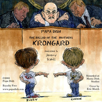 WALL STREET ------------------------------------------ In yet another sordid tale so familiar to the morally bankrupt Bush administration, we learn about the brothers Krongard, Howard "Cookie" and Alvin "Buzzy". Cookie, the State Department's Inspector General was being questioned by the House Oversight and Government Reform Committee for not seriously investigating Blackwater, the infamous security contractor, which thanks to Jeremy Scahill, the brilliant investigative reporter, was uncovered as a rogue firm answering to no one. The committee's investigation revealed that Buzzy, Cookie's brother, was a Blackwater board member, which angered Cookie, who vehemently denied it. A letter from Erik Prince, Blackwater's founder and CEO, welcoming Buzzy to the Blackwater board was produced in these riveting hearings. Cookie called his brother during recess and indeed learned that Buzzy had a significant financial interest in the company and was a member of the board. back to top |